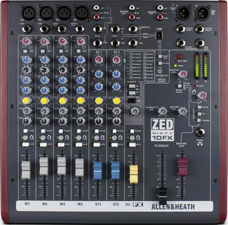 Mono csatorna vezérlők: gain, mélyvágó szűrő, 3-sávos EQ (középfrekvencia változtatható), effekt, aux, panoráma, felvétel kapcsoló, PFL, némítás, hangerő tolópotméter