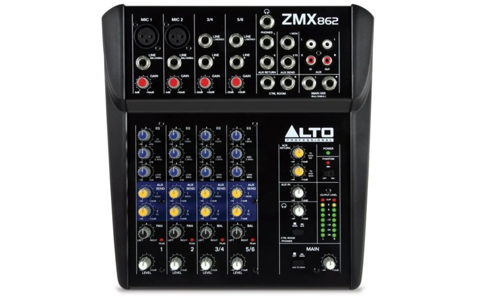 2 mikrofon bemenettel rendelkezik mindkettő phantom táppal, emellett három sávos EQ-val , 2 aux send csatornánként, külső effektekhez, megfigyeléshez, két track bemenet például audio playback-hez. A ZMX862 egy hordozható, professzionális keverőpult. Nem csak dinamikus, kondenzátor vagy vezeték nélküli mikrofonokat csatlakoztathatsz az első 2 csatornába, 2 stereo bemeneti csatornával is fel van szerelve, billentyűkhöz, dobgépekhez, vagy egyéb hangszerekhez. Továbbá könnyedén csatlakoztathatsz MP3 lejátszót, CD lejátszót, vagy DVD lejátszót a CD/Tape bemeneteken keresztül. A keverő 2 Aux send-del rendelkezik, amin keresztül audiot küldhetsz a keverődből digitális effekt egységbe, stage monitorba.