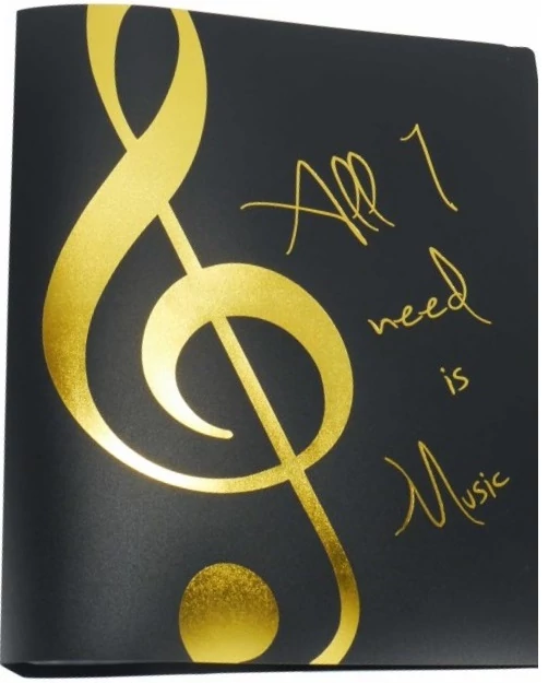 Fekete mappa, arany színű "All I need is Music" felirattal és violinkulccsal, 20 db lefűzött irattartóval