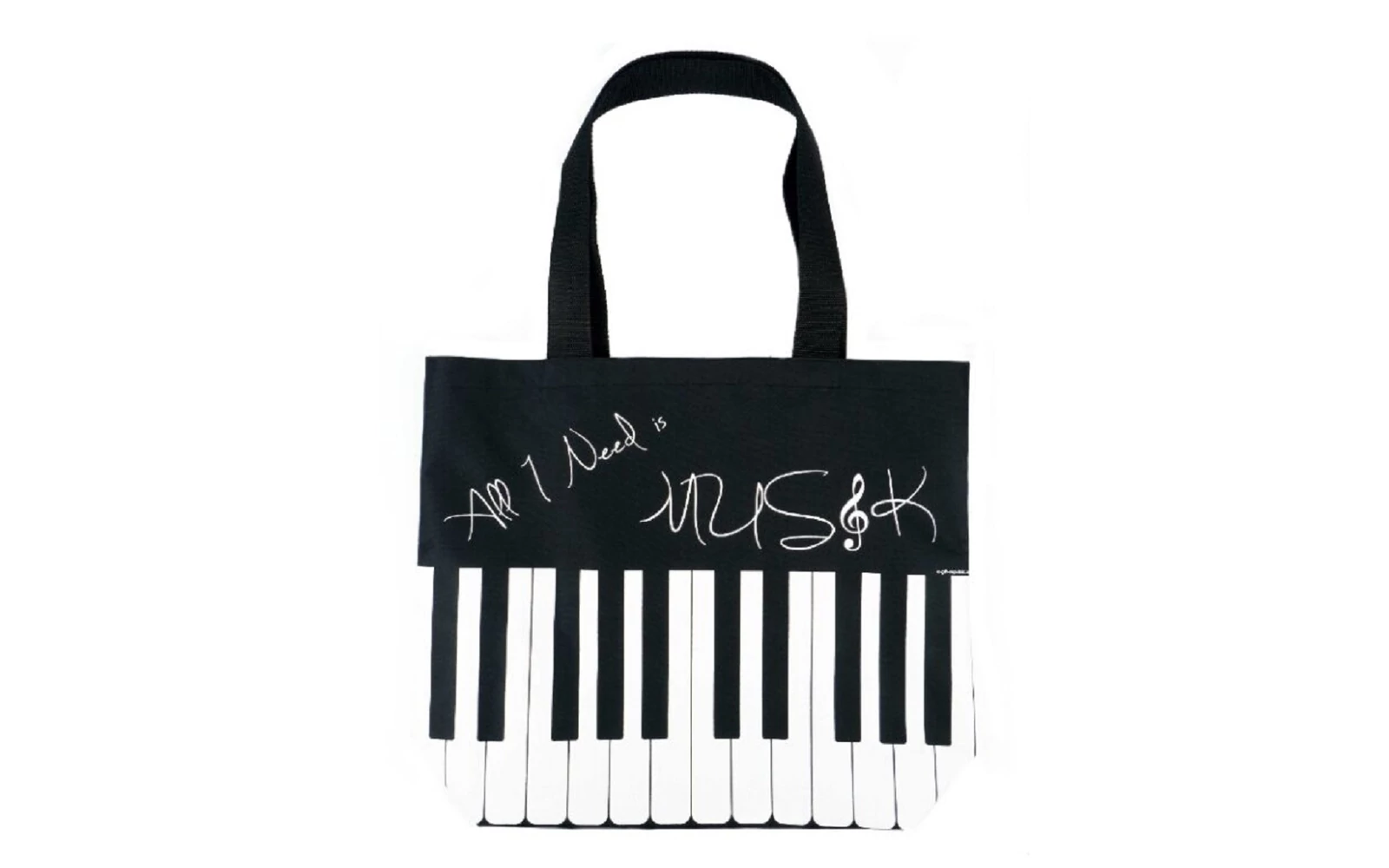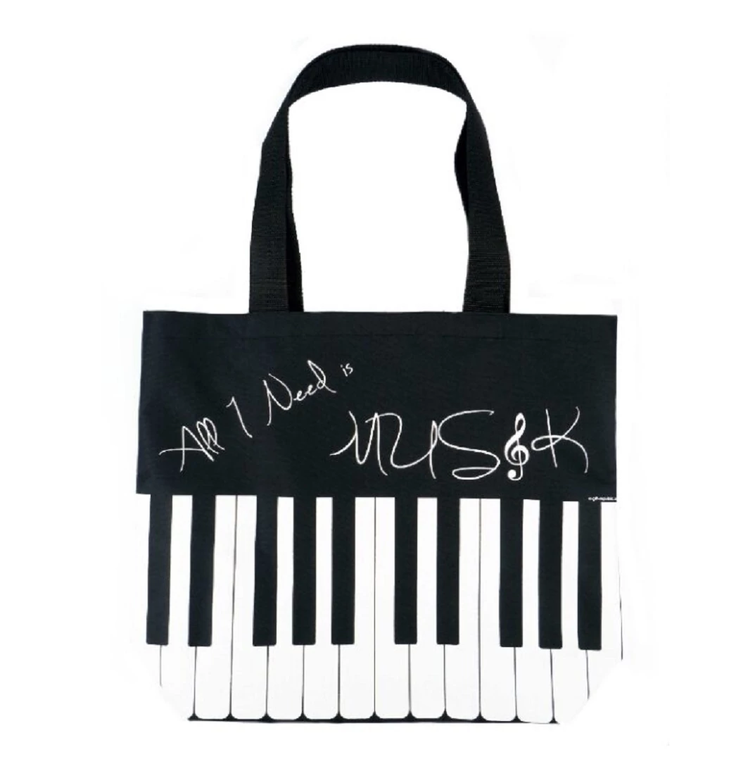 Fekete, zongorabillentyű mintás városi táska AGB3030 "All I need is music" felirattal 45 x 37 x 12 cm Zenei ajándéktárgy