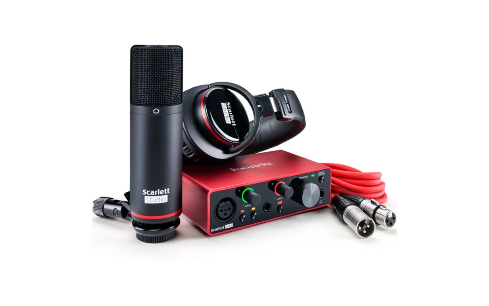 Az interfész mellett egy nagymembrános kondenzátor mikrofont, egy 3 méteres XLR kábelt valamint egy zárt kialakítású fejhallgatót és számtalan szoftvert tartalmaz a doboz.