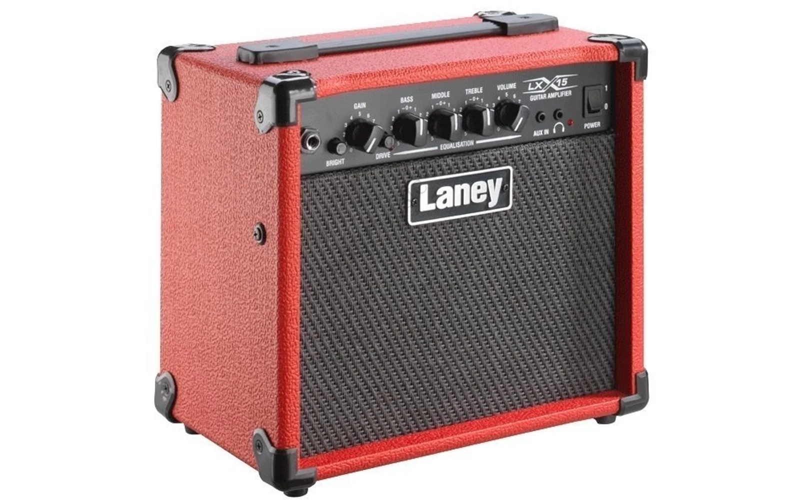 autentikus Laney hangzás, 15 W teljesítmény, 2x 5" Custom driver, 3 sávos EQ, Bright kapcsoló, Volume és Gain szabályzók, Mini Jack kimenet, méretek: 30 x 20 x 28 cm, súly: 5 kg, piros kivitel