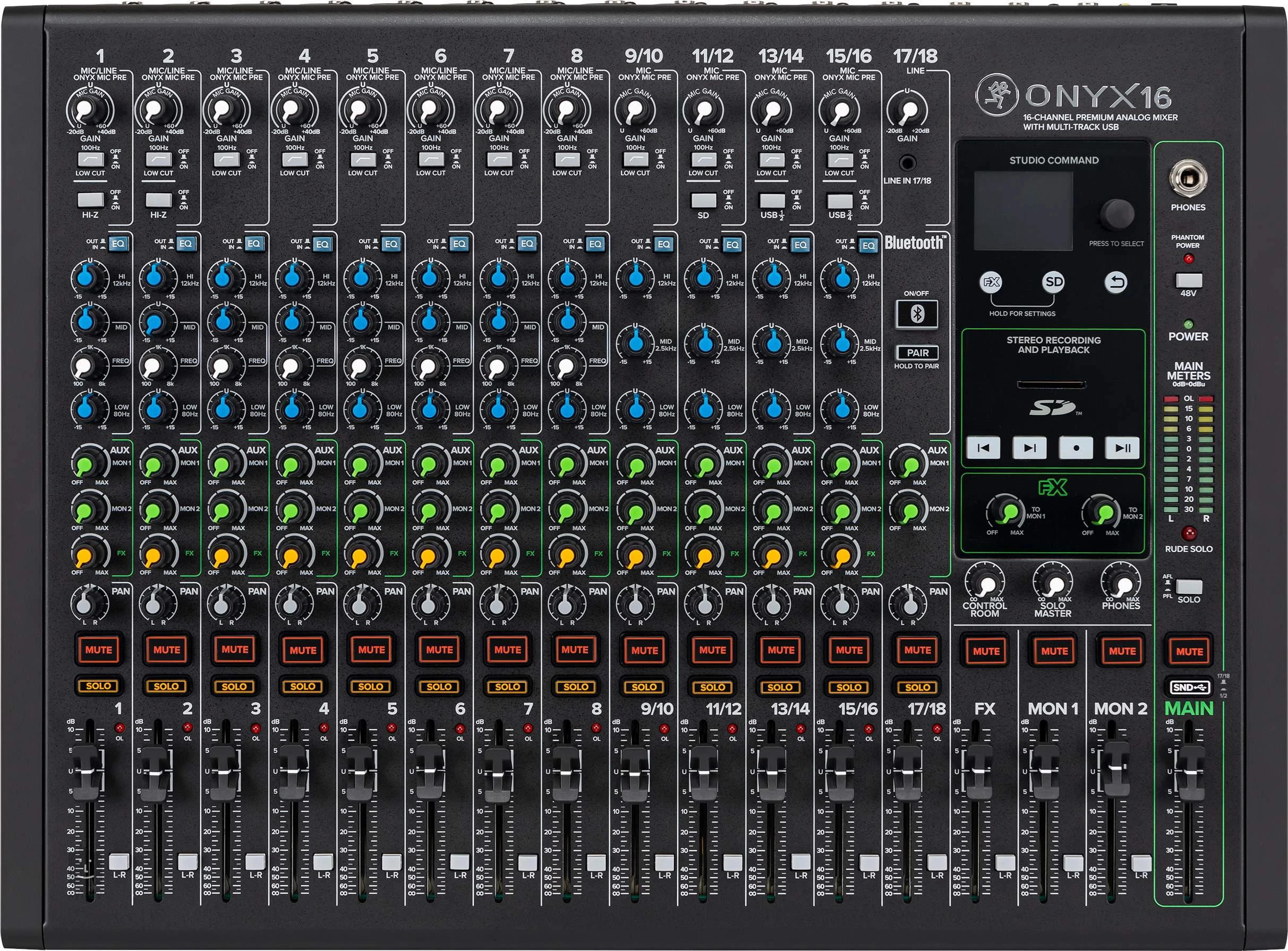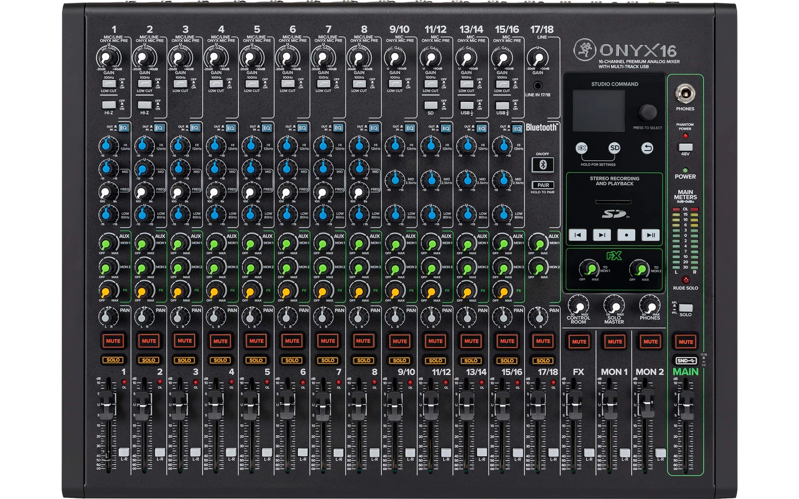 A Mackie ONYX16 prémium analóg keverőpultja alkalmas élő előadás hangosítására zenei klubokban, próbatermekben, otthoni felvételek készítésére vagy kisebb, különböző típusú rendezvényeken.