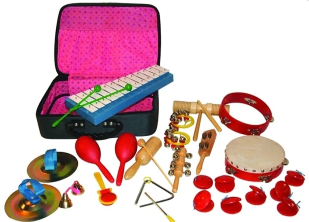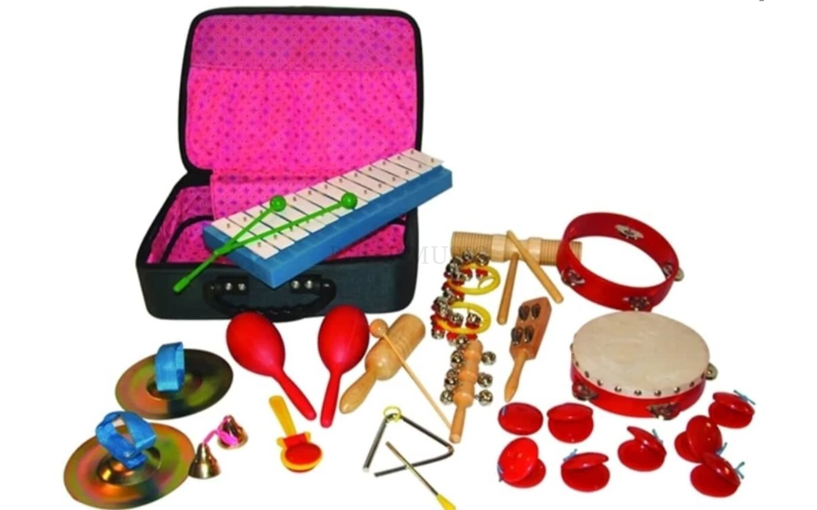 A készlet tartalma: triangulum, 2 oktávos metalofon, 1 pár maracas, 1 pár cintányér