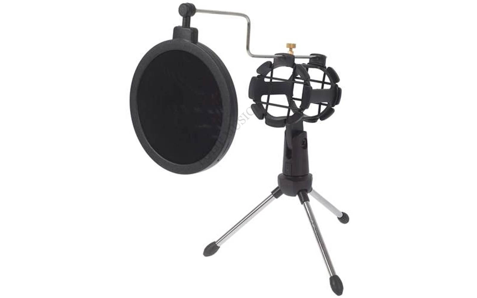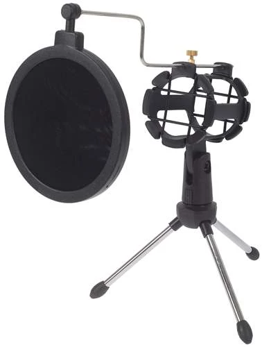 Praktikus asztali mikrofonállvány háromlábú talppal, párnázott mikrofontartóval és popszűrővel.