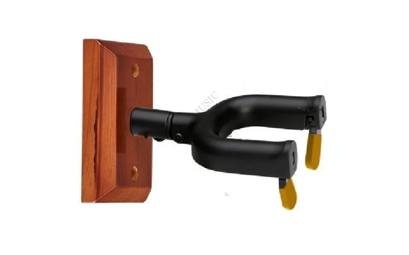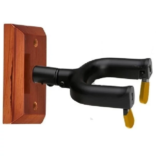 Univerzális gitár tartó fali tartóval. Automata reteszelő rendszerrel és fa alaptal. Szín: fekete / fa