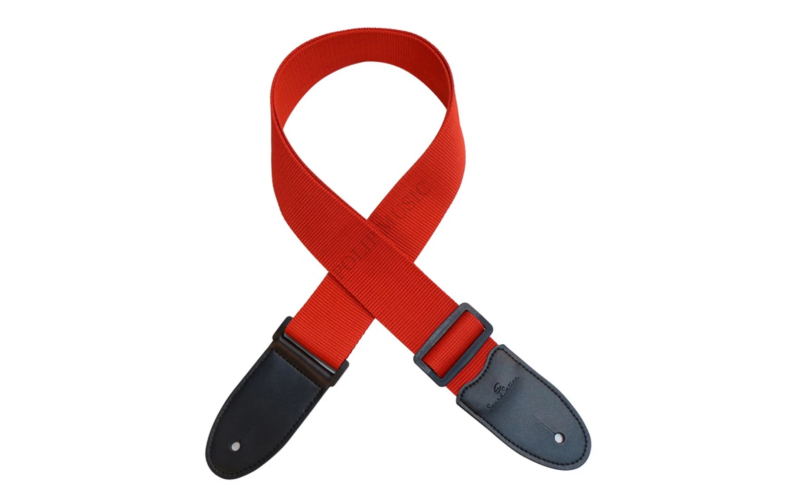 Állítható nylon gitár heveder, műbőr végekkel, 5 cm széles, élénk piros színű.