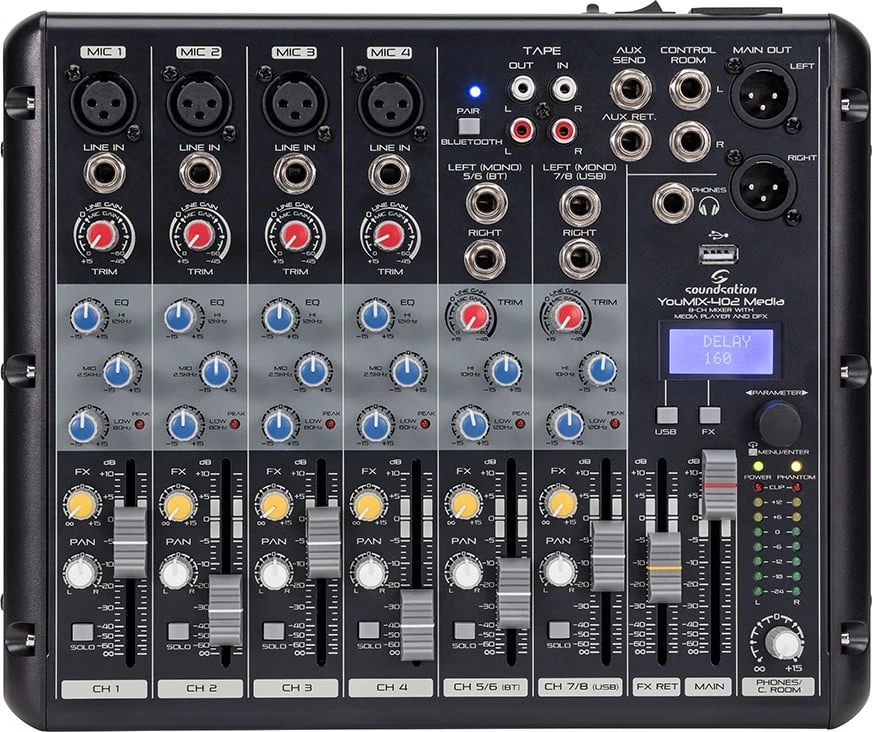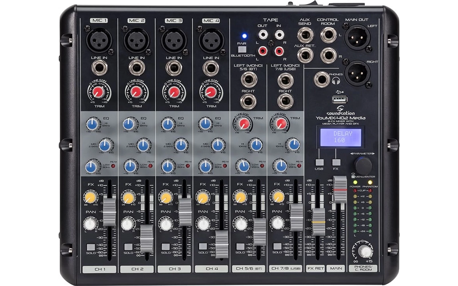 Fő vezérlők: FX Return 60mm Level Slider, 60mm Main Level Slider, 60mm Phones/Control Room Volume Slider, Power On Led Indicator, Phantom On Led Indicator, 2x8 Led Vu Meter Bar (Main Level/Solo), 2x8 karakteres LCD kijelző (MP3 player/multieffect)
