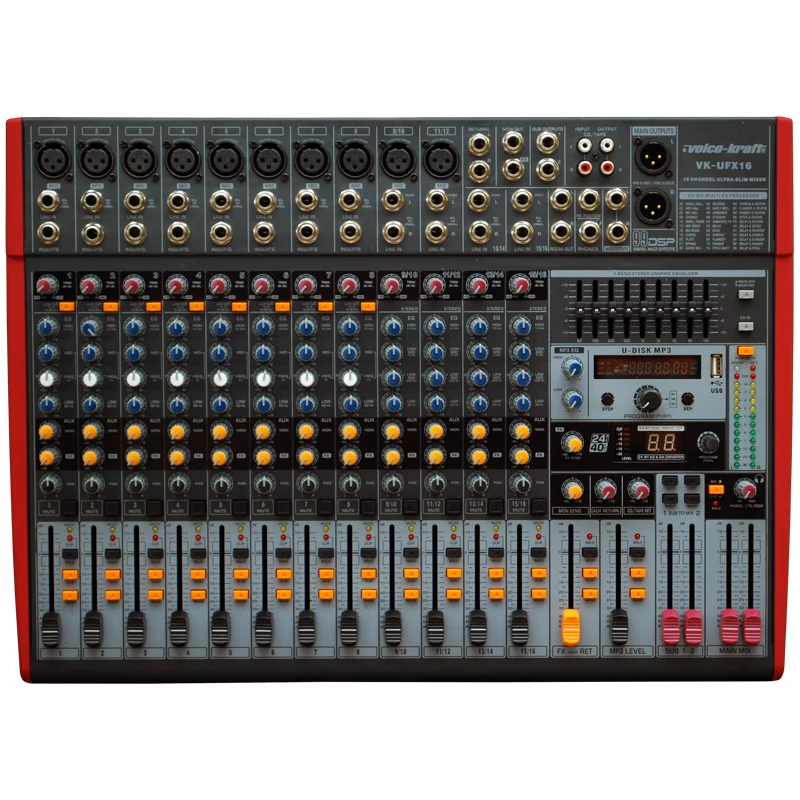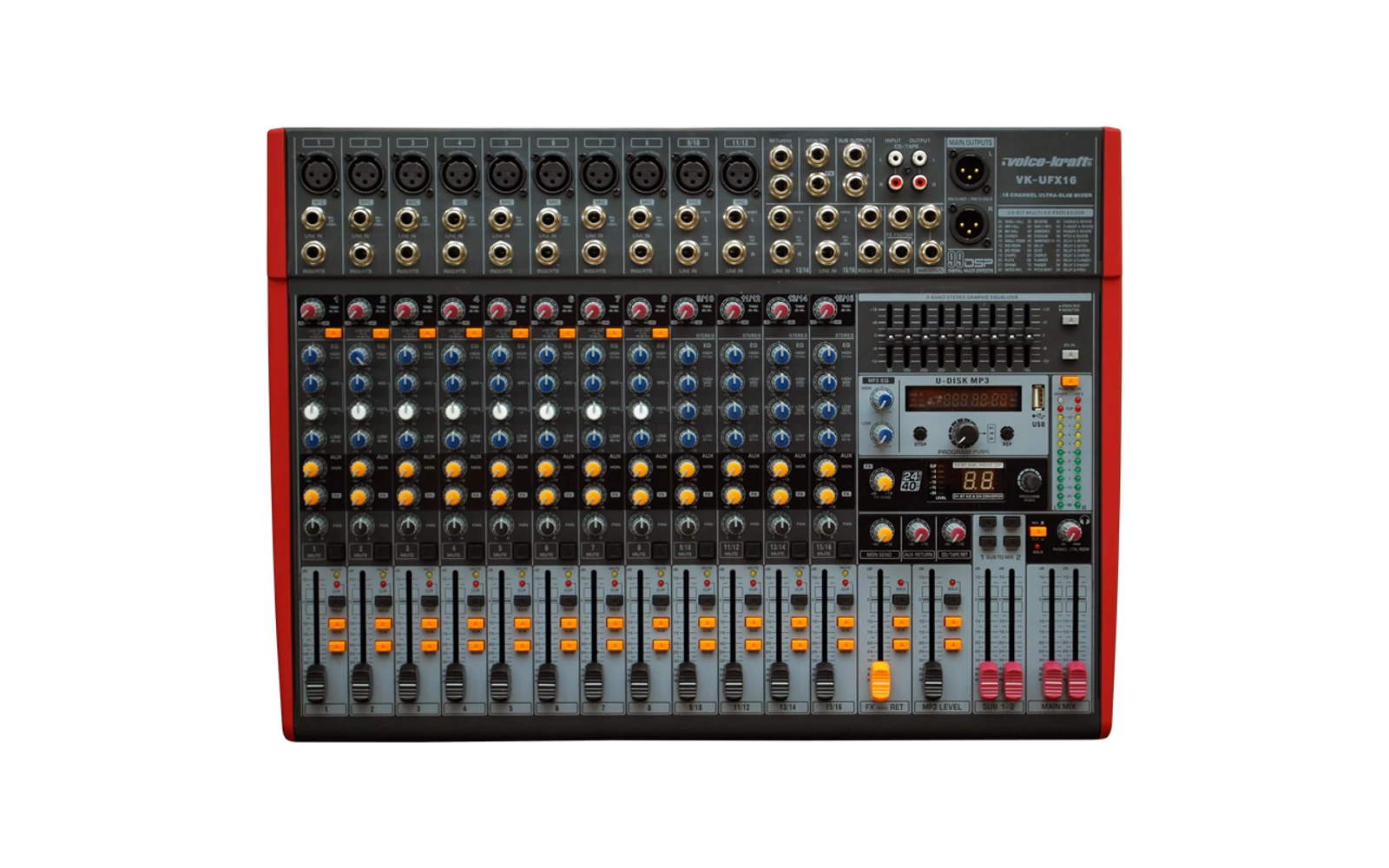 Voice-Kraft UFX16 10 mik.8 monó, 2 mono/sztereó és 2 sztereó csatornás keverő