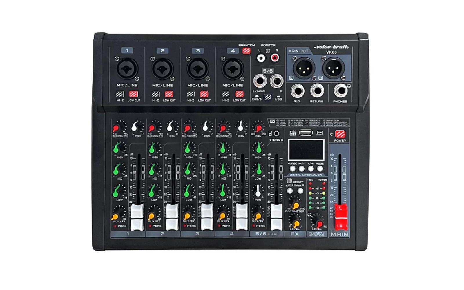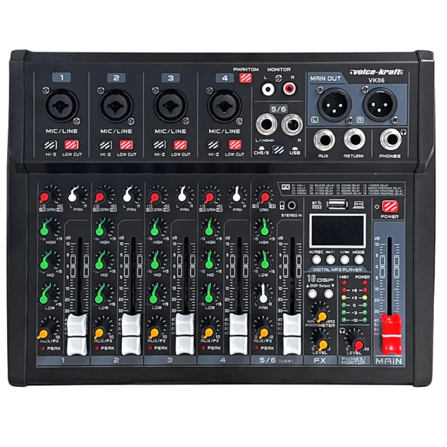 Voice Kraft VK06 Keverőpult 4 mono/1 sztereo csatorna, USB Audio interface, Bluetooth, 16 DSP effect