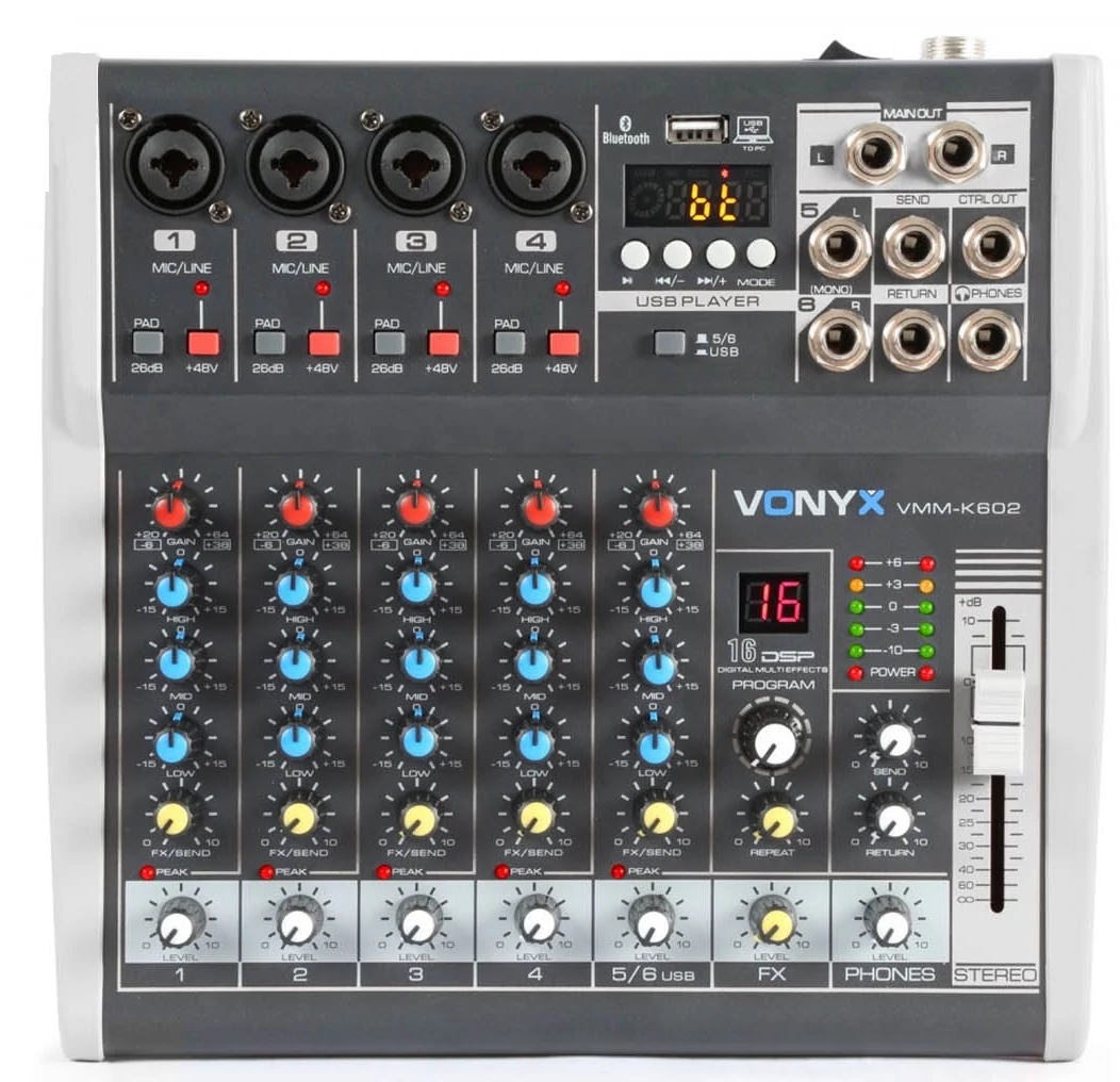 A Vonyx VMM-K szériás keverők mindegyike beépített USB csatlakozással rendelkezik. Külső eszközt rákötve hangkártyaként üzemel, továbbá képes pendrive-ról zenét lejátszani valamint hangot felvenni rá. A lejátszó egyben Bluetooth vevő is, amire akár laptoppal, akár mobiltelefonnal tudunk csatlakozni. Nagyon jól felszerelt, jó minőségű keverő, beépített DSP digitális effektprocesszorral, 16 előre beállított effekttel. Ebben az árfekvésben kiemelendő, hogy az összes csatornán független mély - közép - magas hangszínszabályzási lehetőségünk is van, valamint rendelkezik phantom táppal, így akár kondenzátor mikrofon is köthető rá. A monó csatornák mindegyike állítható jelszintű bemenettel van ellátva. A termék nagyon széles körben alkalmazható, ideális lehet kisebb zenekarok, hangosítók számára, könnyen szállítható, sok funkcióval felszerelt megfizethető keverő.