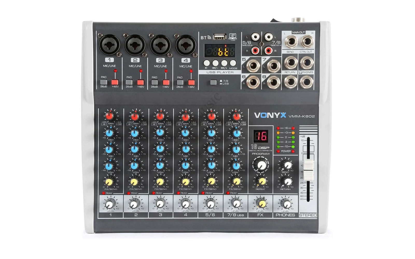 A Vonyx VMM-K szériás keverők mindegyike beépített USB csatlakozással rendelkezik. Külső eszközt rákötve hangkártyaként üzemel, továbbá képes pendrive-ról zenét lejátszani valamint hangot felvenni rá. Ez a keverőszéria USB-vel képes laptophoz csatlakozni, amin lehetőségünk van a keverőn átmenő hanganyagok rögzítésére. Ekkor a Main Out hangkimenet jele kerül rögzítésre, tehát nem külön-külön a hangsávok, hanem együttesen mind. Erre alkalmas szoftver pl. az Audacity, melyet ingyenesen letölthetnek a gyártó weboldaláról. A lejátszó egyben Bluetooth vevő is, amire akár laptoppal, akár mobiltelefonnal tudunk csatlakozni. Nagyon jól felszerelt, jó minőségű keverő, beépített DSP digitális effektprocesszorral, 16 előre beállított effekttel. Ebben az árfekvésben kiemelendő, hogy az összes csatornán független mély – közép – magas hangszínszabályzási lehetőségünk is van, valamint rendelkezik phantom táppal, így akár kondenzátor mikrofon is köthető rá. A monó csatornák mindegyike állítható jelszintű bemenettel van ellátva. A termék nagyon széles körben alkalmazható, ideális lehet kisebb zenekarok, hangosítók számára, könnyen szállítható, sok funkcióval felszerelt megfizethető keverő.