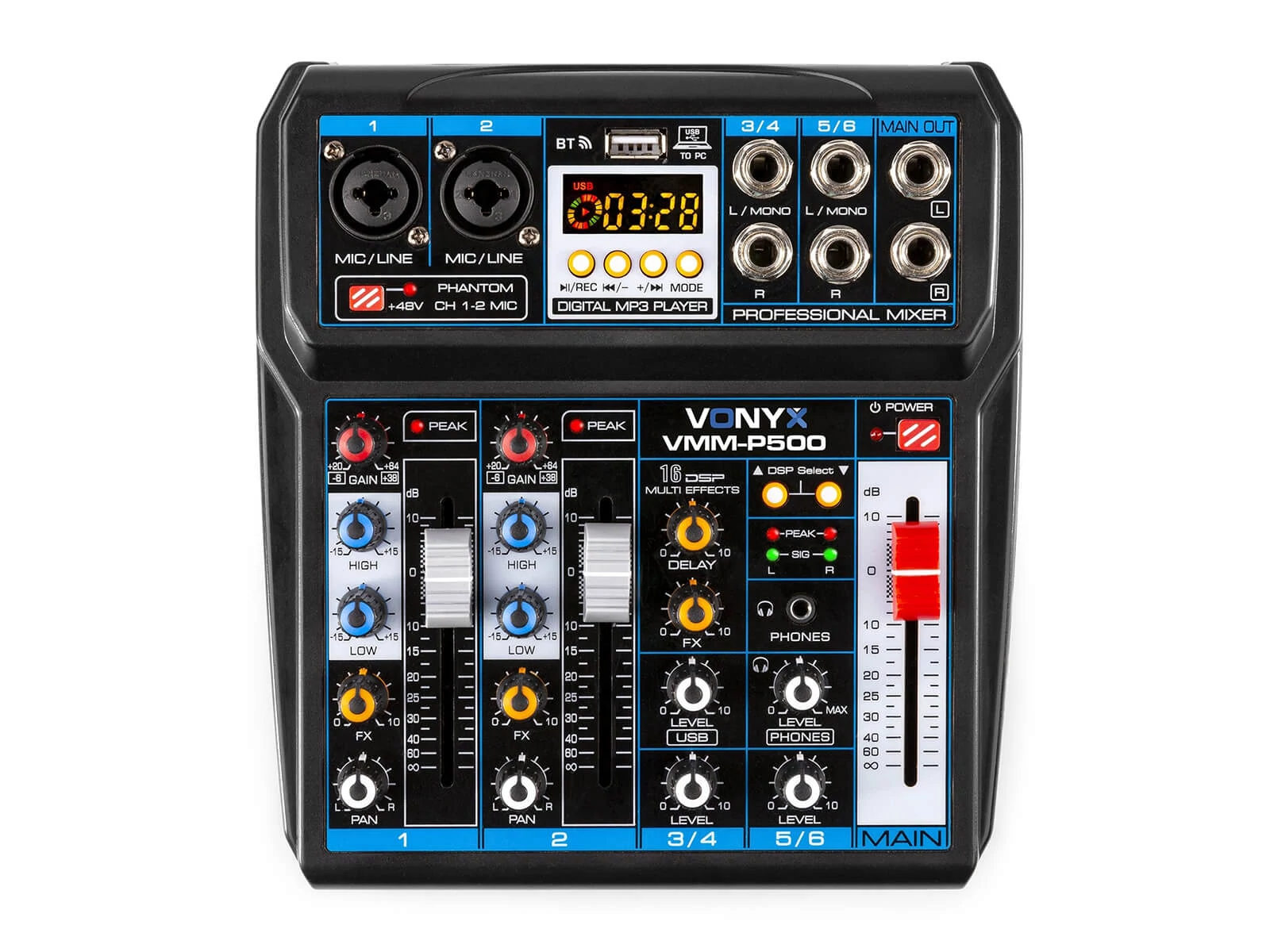 A Vonyx VMM-P500 keverő beépített USB csatlakozással rendelkezik. Külső eszközt rákötve hangkártyaként üzemel, továbbá képes pendrive-ról zenét lejátszani valamint hangot felvenni rá. Ez a keverő USB-vel képes számítógéphez csatlakozni, amin lehetőségünk van a keverőn átmenő hanganyagok rögzítésére. Ekkor a Main Out hangkimenet jele kerül rögzítésre, tehát nem külön-külön a hangsávok, hanem együttesen mind. Erre alkalmas szoftver pl. az Audacity, melyet ingyenesen letölthetnek a gyártó weboldaláról. A lejátszó egyben Bluetooth vevő is, amire akár laptoppal, akár mobiltelefonnal tudunk csatlakozni. Nagyon jól felszerelt, jó minőségű keverő, beépített DSP digitális effektprocesszorral, 16 előre beállított effekttel. Ebben az árfekvésben kiemelendő, hogy rendelkezik phantom táppal, így akár kondenzátor mikrofon is köthető rá. A monó csatornák mindegyike állítható jelszintű bemenettel van ellátva. A termék nagyon széles körben alkalmazható, ideális lehet kisebb zenekarok, hangosítók számára, élő közvetítésekhez, broadcast, podcast, youtuber felhasználásra. Sok funkcióval felszerelt megfizethető keverő.